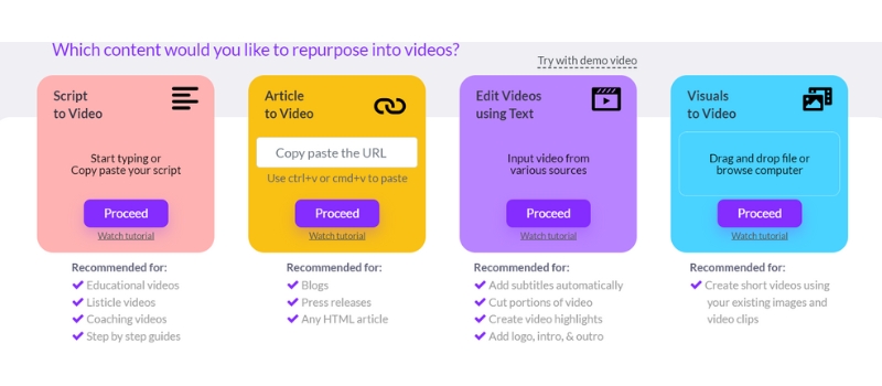 Pictory cho phép người dùng tải lên các văn bản dài hoặc video dài và AI sẽ tự động quét qua một số hình ảnh và video miễn phí bản quyền để đồng bộ hóa với tập lệnh đã nhập. Sau đó, Pictory tạo ra các video ngắn, mạnh mẽ, phù hợp với kịch bản và truyền tải hoàn hảo thông điệp đã định.