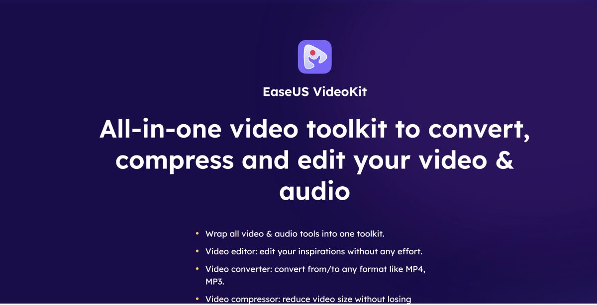 Bộ công cụ video EaseUS được thiết kế để chuyển đổi, nén và chỉnh sửa các tệp video và âm thanh của bạn. Nó kết hợp tất cả các chương trình chỉnh sửa video trong không gian làm việc một cửa và cung cấp cho bất kỳ người tạo video nào quyền truy cập đầy đủ vào trình chuyển đổi video, trình nén video, trình chỉnh sửa video và Trình tạo GIF tốt nhất.